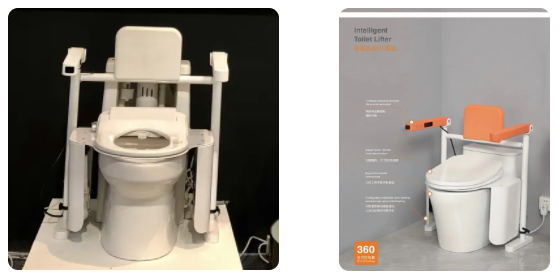 智能如厕升降器,采用电动升降系统,解决老年人如厕起身和下蹲问题,扶手集成升降按钮及SOS一键紧急呼救按钮。