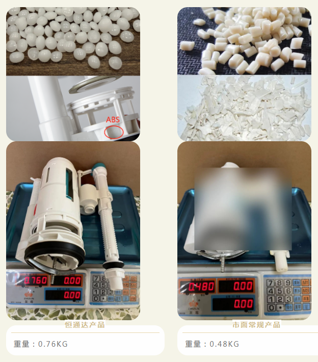 恒通达水件采用抗老化ABS全新优质原料进行铸造,有别于市面上为了降低成本而使用的所谓“改性”材料甚至二次及多次料,抗老化、抗腐蚀、抗冲击性,性能稳定,使用寿命更长久,守护您的卫浴安全。