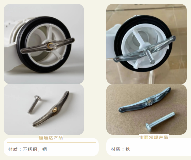 恒通达水件的金属构件采用304不锈钢弯螺丝,优质铜螺母,防断裂,不易生锈,更耐用。不因为追求低成本而降低产品品质。