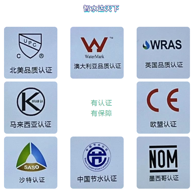 恒通达水件产品已获得CQC中国节水、美国/加拿大UPC/CUPC、马来西亚IKRAM、欧盟CE、澳大利亚Watermark,英国WRAS、墨西哥NOM、沙特SASO等多个国家认证,出色的产品技术保证了我们为全球卫浴品牌提供先进的卫浴配件和专业的解决方案。